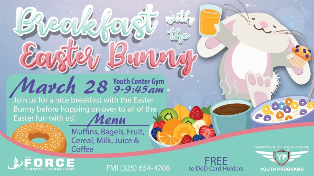 Have breakfast with the Easter Bunny before Eggstravaganza from 9-9:45am in the Youth Center Gym. Breakfast items include: Muffins, Bagels, Fruit, Cereal, Milk, Juice & Coffee.