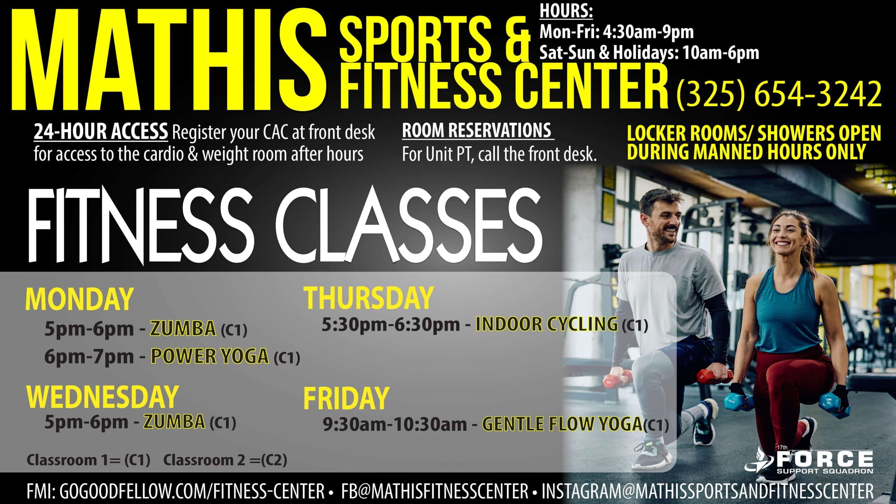 Mathis Sports & Fitness Center is one of three fitness options available at Goodfellow. Located across from the Arts & Crafts Center, this fitness center features a variety of cardio and strength equipment as well as basketball, volleyball and tennis courts.